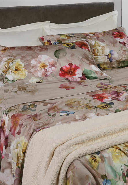 Completo lenzuola matrimoniale effetto copriletto con stampa a fiori su sfondo beige. Morbido percalle di...