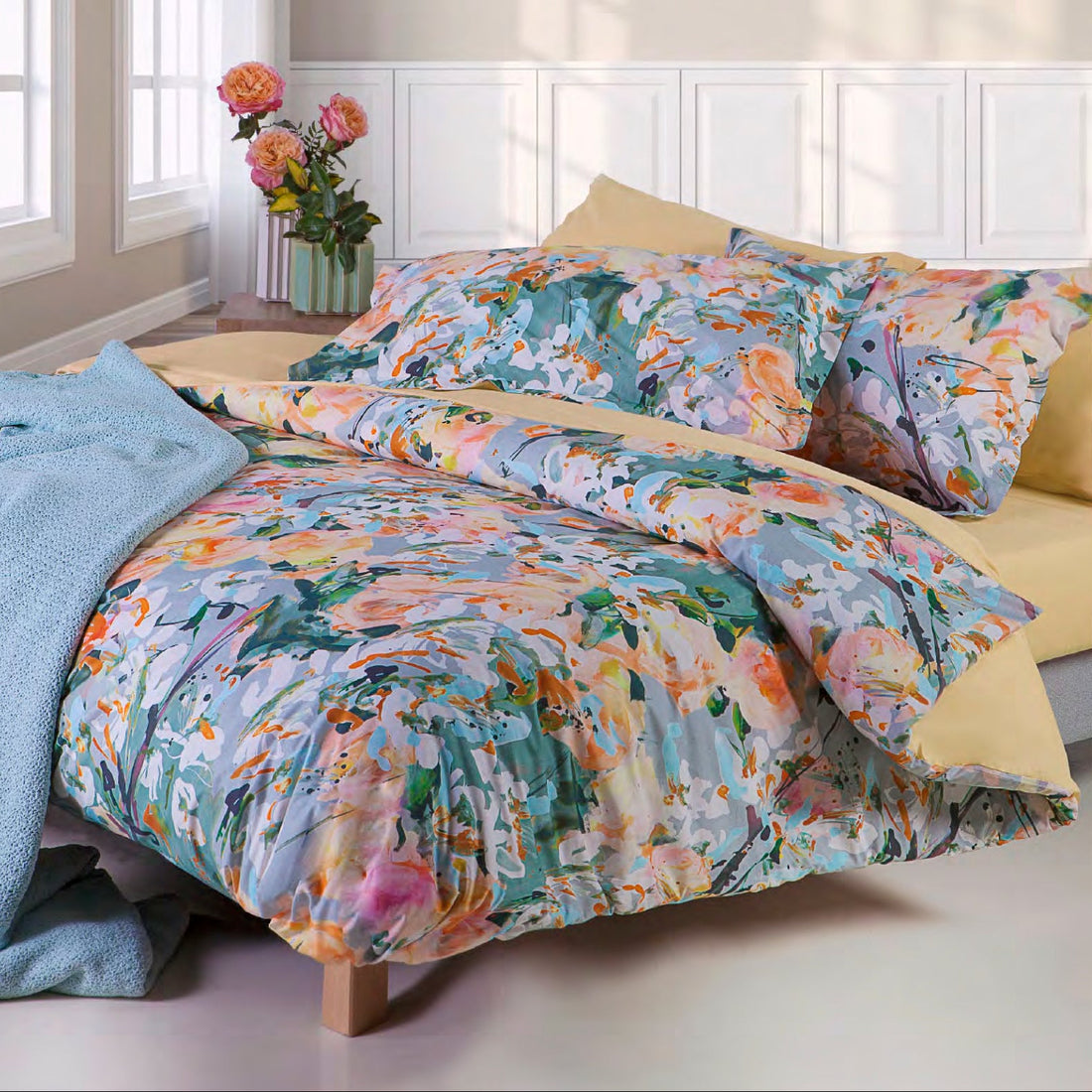 Completo lenzuola matrimoniale effetto copriletto in pregiato Percalle di Cotone Louisiana, con magnifica stampa floreale. Delicata...