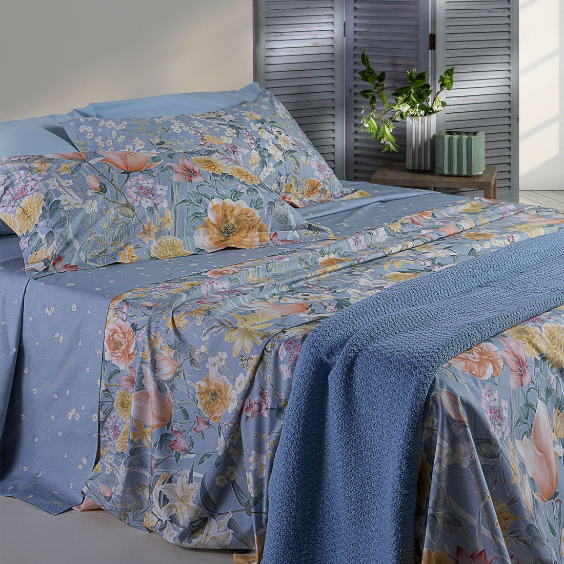 Completo Lenzuola Copriletto Matrimoniale MIRABELLO Emporium - Festa di Primavera Blu