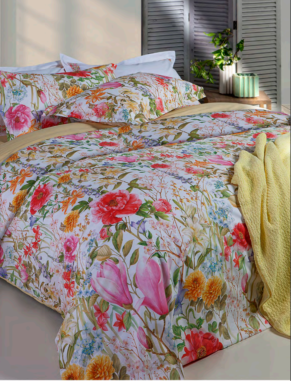 Completo lenzuola matrimoniale effetto copriletto in pregiato Percalle di Cotone Louisiana, con magnifica stampa floreale. Delicata...