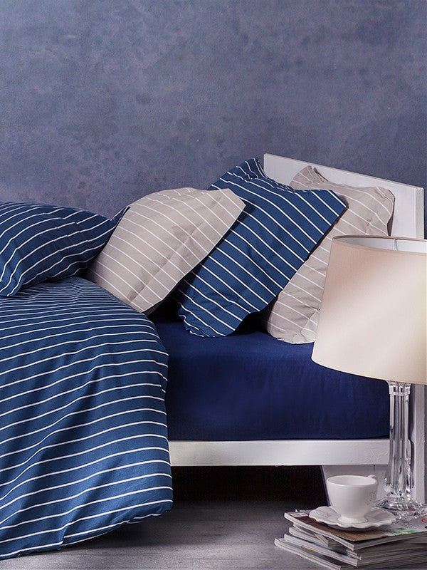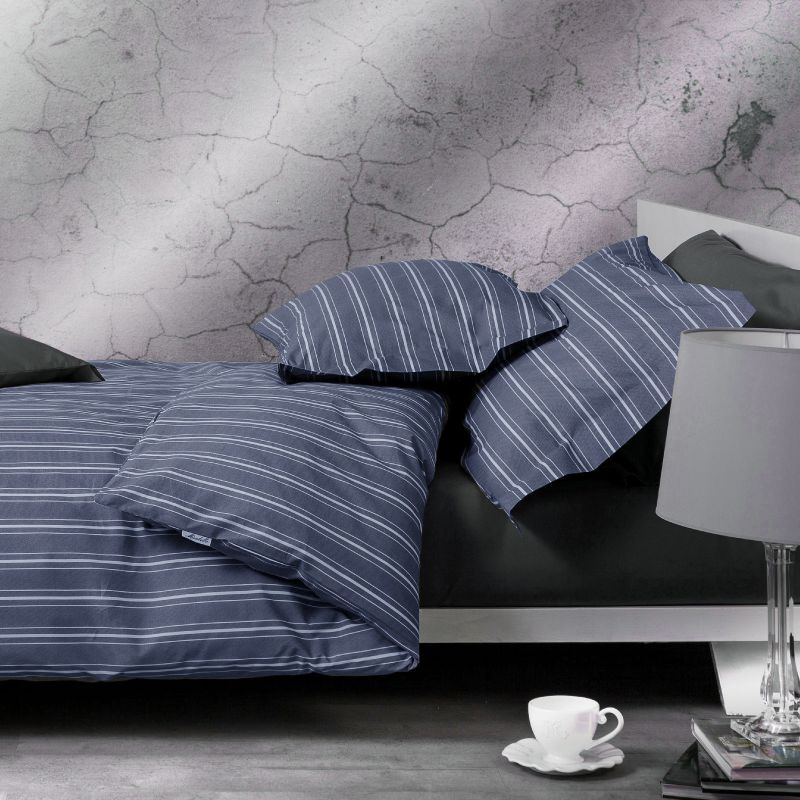 Parure copripiumino in percalle di cotone Luisiana di Mirabello, con righe gessate bianche su fondo tinta...