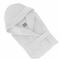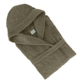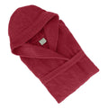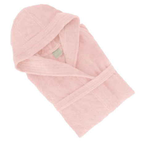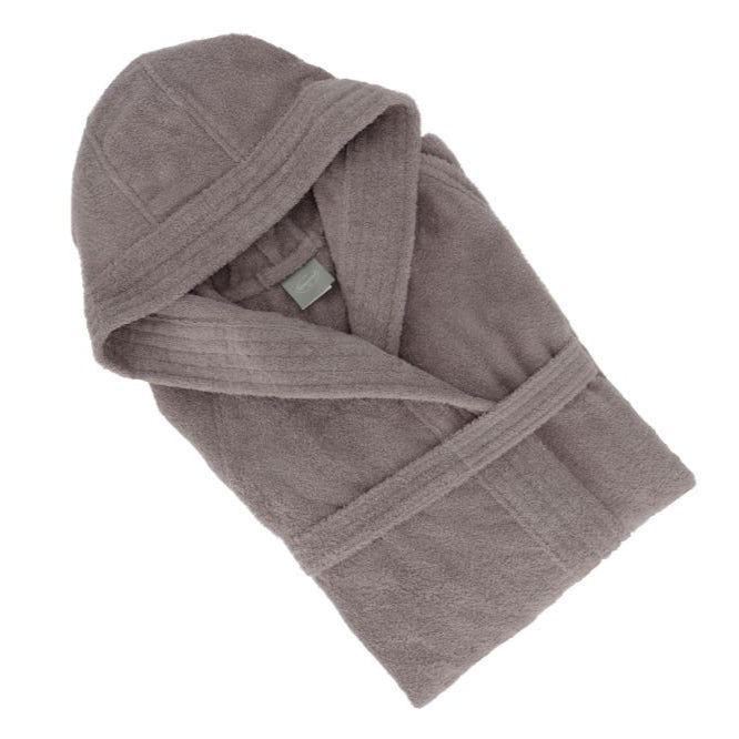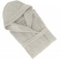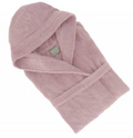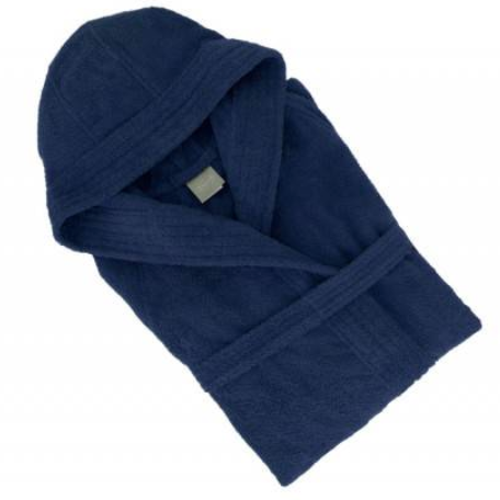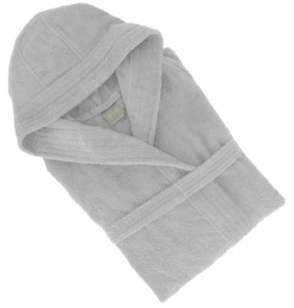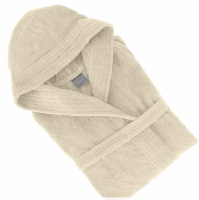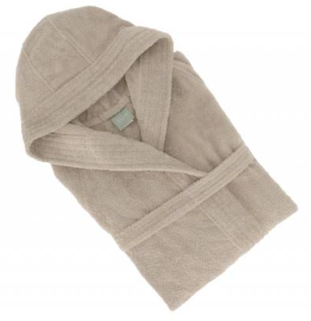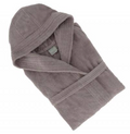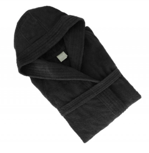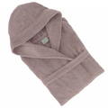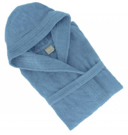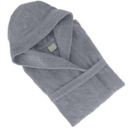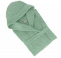 Solid color pure hydrophilic cotton terry bathrobe. Model with hood.