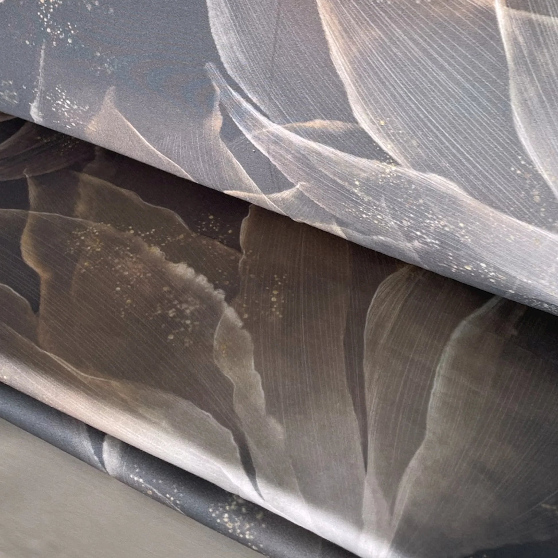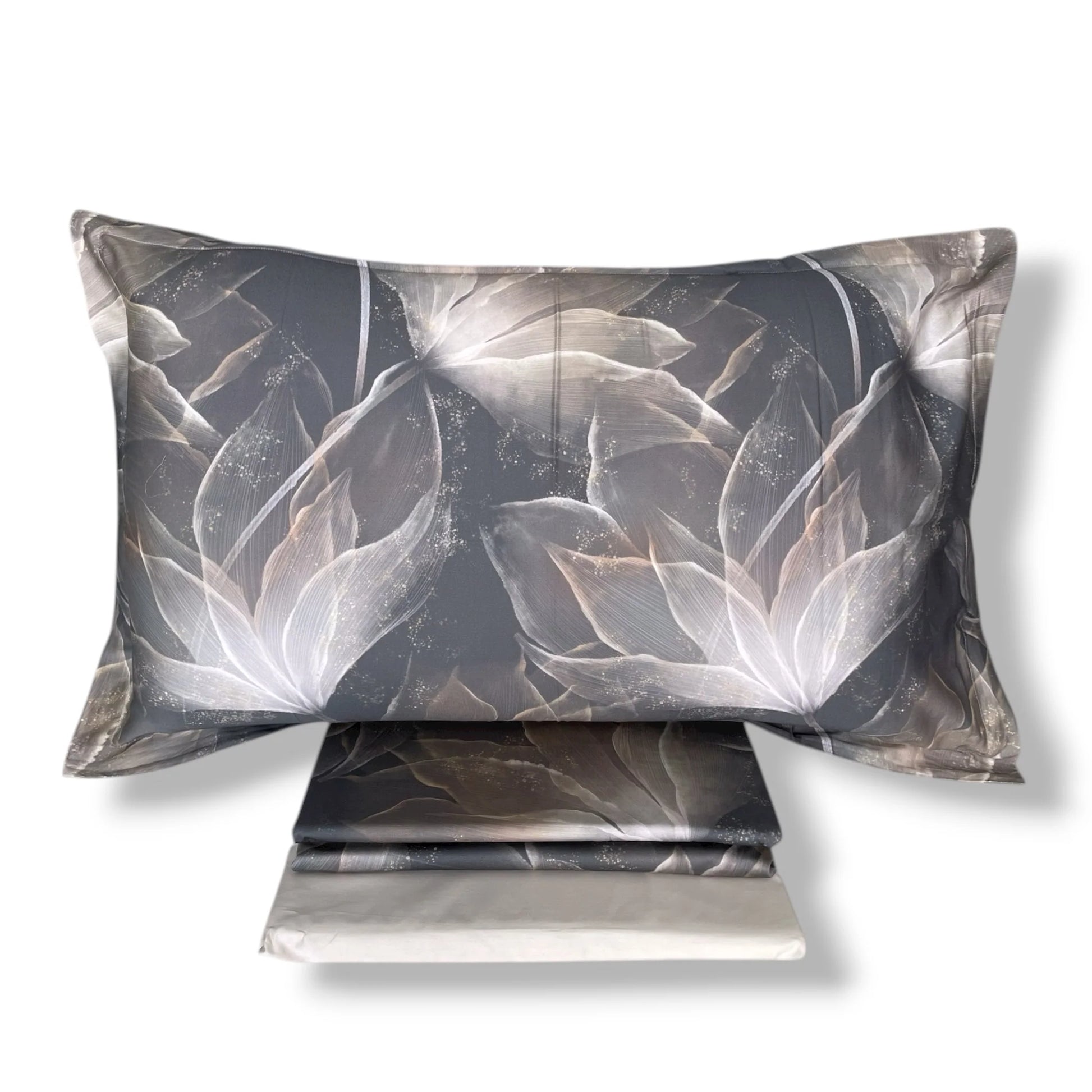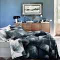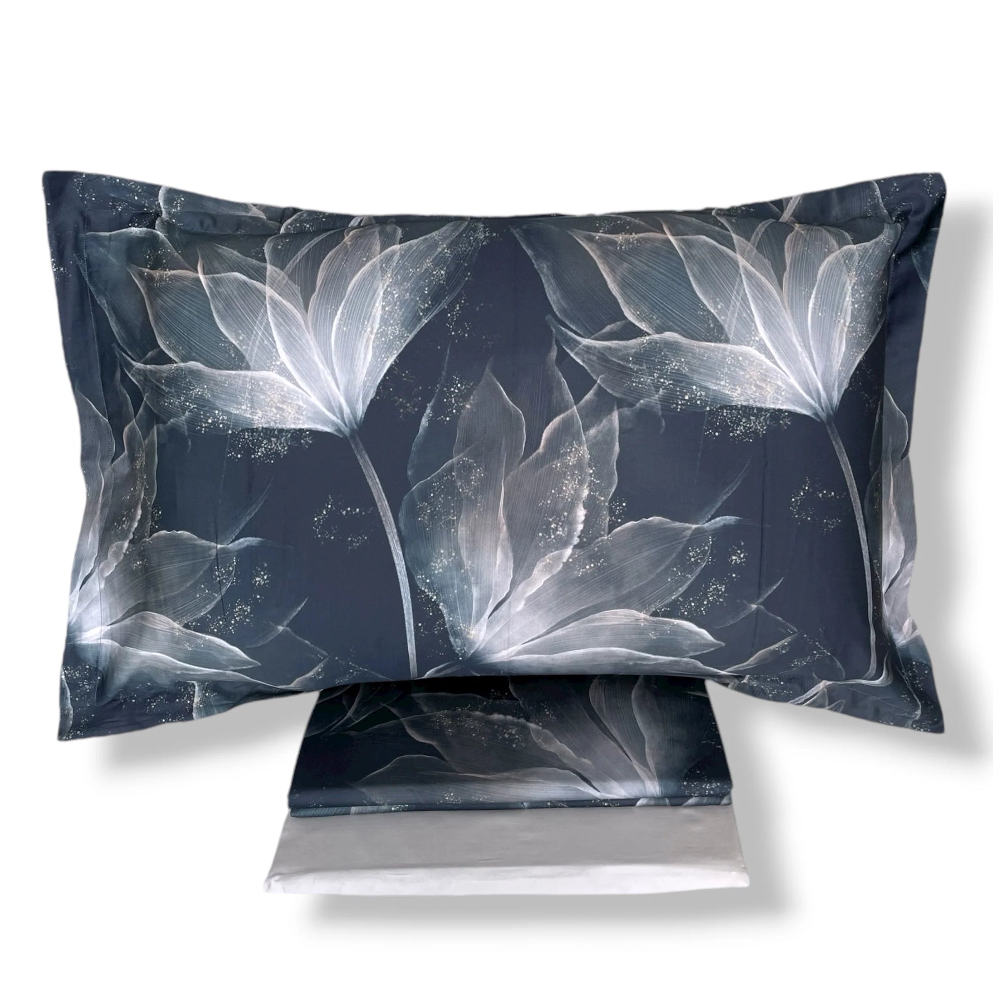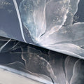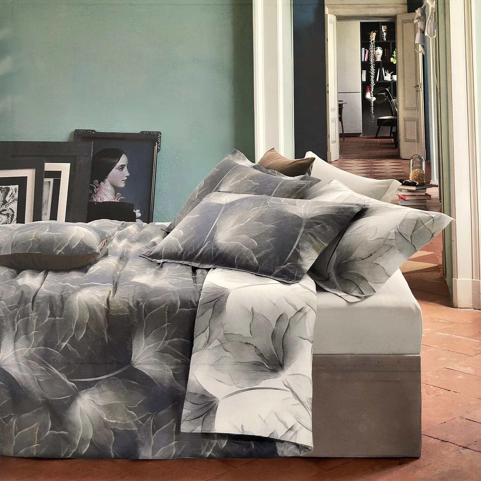 Il raffinato motivo floreale stilizzato e i colori eleganti – tortora o blu – rendono questo completo perfetto per ambienti contemporanei e sofisticati.
