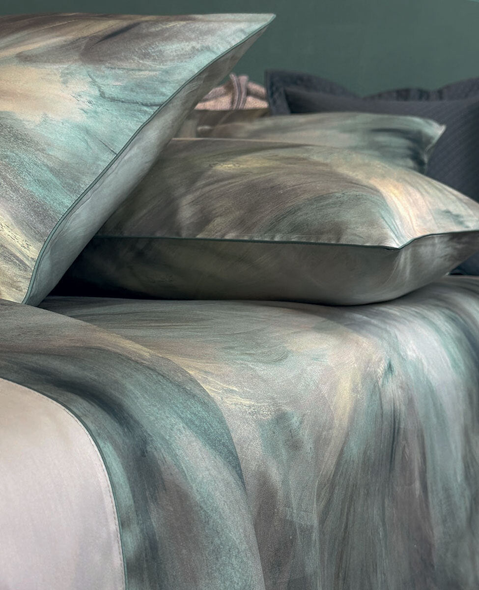La parte superiore del sacco presenta un’elegante risvolta in tinta unita rifinita da piping, mentre la parte inferiore mantiene la stampa all over, per un effetto armonioso e ricercato. Le federe a sacchetto, anch’esse stampate e impreziosite da una delicata coda di topo, completano il look con cura sartoriale.