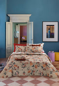 Completo lenzuola matrimoniale effetto copriletto in pregiato Percalle di Cotone Louisiana, con magnifica stampa floreale. Delicata fantasia floreale per un lenzuolo che diventa complemento d'arredo. Elegante e raffinato in puro stile italiano, come solo Mirabello sa fare. Il set letto è composto da lenzuolo copriletto piatto, lenzuolo con angoli e due federe a tre volant.