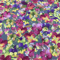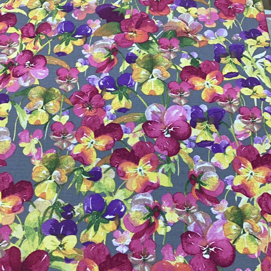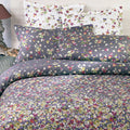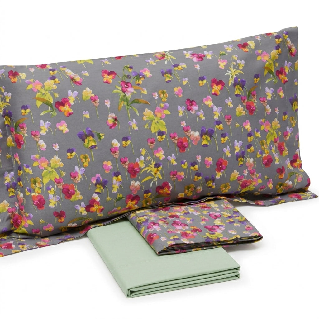 Double bed sheet set with bedspread effect with flower print on the top sheet and pillowcases, bottom sheet with corners in plain charcoal grey. Soft cotton percale, i.e. made with very fine but more compact and combed cotton yarns, to make it silky to the touch. The bed set consists of a flat bedspread sheet, a fitted sheet and two three-ruffle pillowcases.