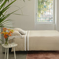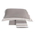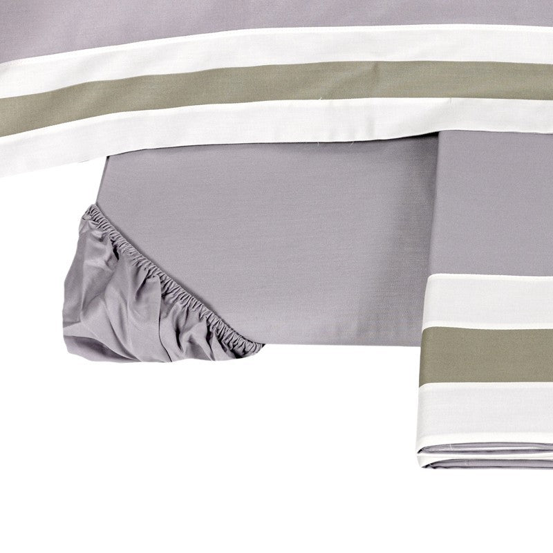 Il lenzuolo con angoli è in tinta unita, comprensivo di elastico sull'intero lato testa e lato piedi, che offre versatilità anche su misure di materasso più piccole. Una triplice bordatura ricamata decora la balza del lenzuolo e i volani delle federe.