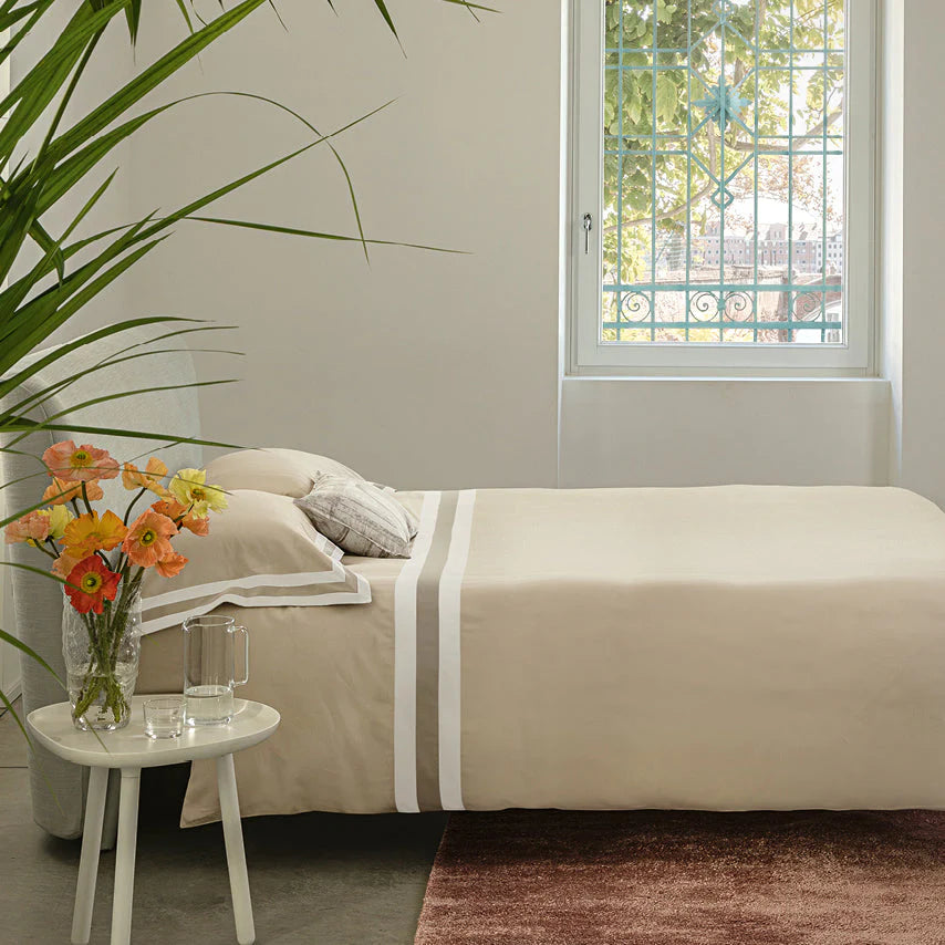 Il completo lenzuolo Sentieri è realizzato in 100% raso puro cotone, ideale per un sonno ristoratore e un dolce risveglio.