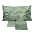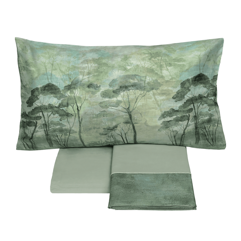 Scopri il completo lenzuola Nemora della collezione Autunno/Inverno, un equilibrio perfetto tra comfort e raffinatezza. La faccia superiore delle federe e l’alta balza del lenzuolo sono in prezioso raso 300TC di puro cotone con stampa digitale ispirata ai boschi mitologici, mentre il resto del completo è realizzato in morbida percalle tinta unita. Disponibile in calde tonalità neutre o verdi di stagione. Un tocco di eleganza e naturalezza per trasformare la tua camera in un’oasi di benessere.
