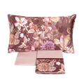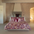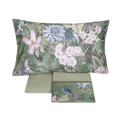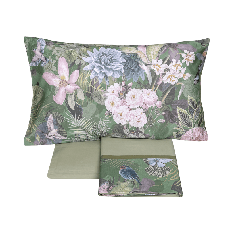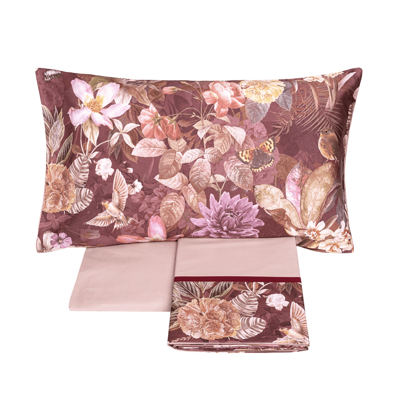 Realizzato in raso 300TC di puro cotone, il completo presenta stampa digitale sul lato superiore delle federe e sull’alta balza del lenzuolo, impreziosita da un elegante bordo a contrasto. Il resto del completo è in percalle di cotone tinta unita, per un tocco raffinato e versatile. Le tonalità di verde, burgundy e rosa arredamento insieme ai neutri rendono questo completo un vero protagonista della camera da letto.