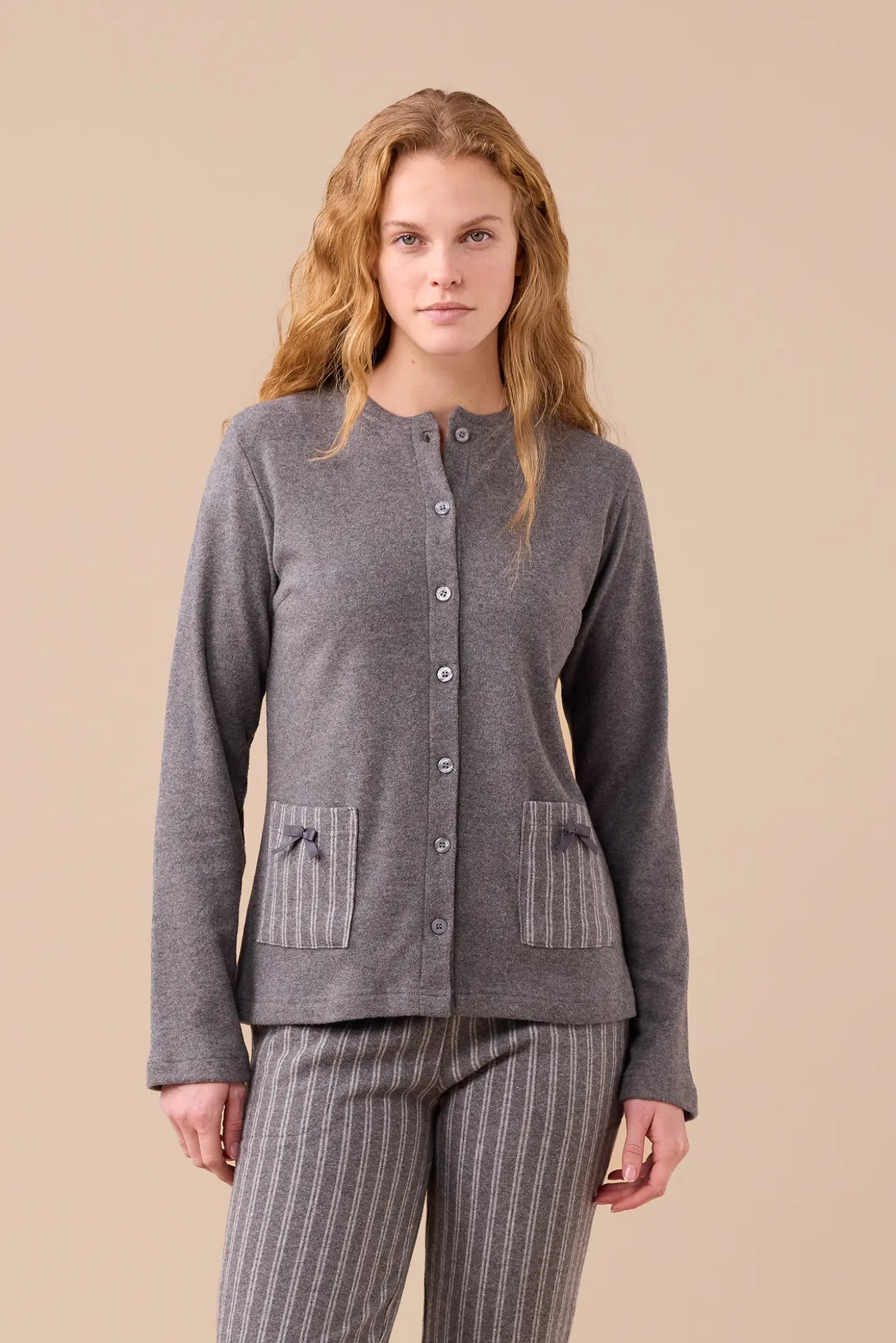 Il top con abbottonatura frontale e pratiche tasche garantisce comodità e stile, mentre i pantaloni con polsini sul fondo assicurano vestibilità perfetta e libertà di movimento. Un capo ideale per il relax serale, combinando raffinatezza, comfort e qualità Made in Italy.