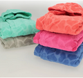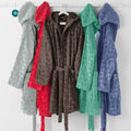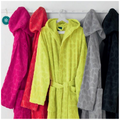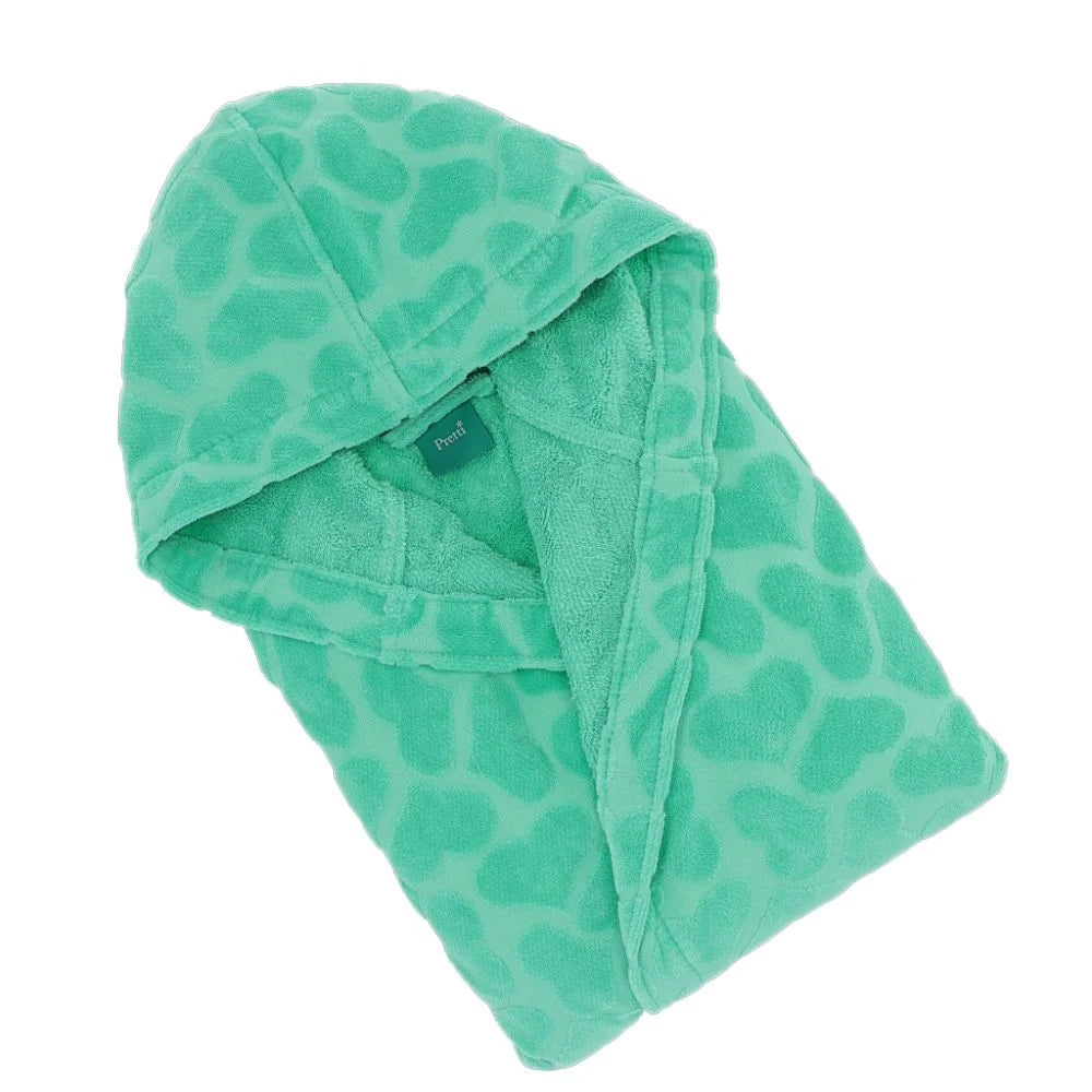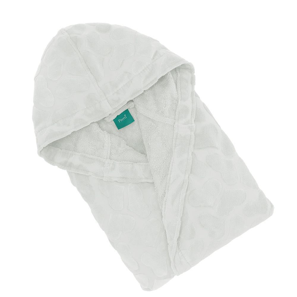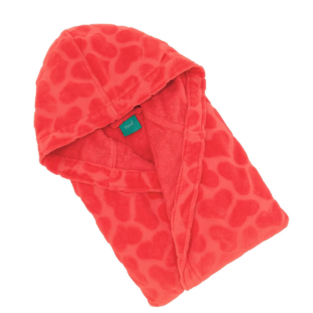 Realizzato in morbida spugna jacquard tinta unita 100% cotone, è decorato con una romantica cascata di cuori che lo rende femminile e accattivante. Dotato di cintura abbinata e cappuccio, è ideale dopo la doccia o per i tuoi momenti di relax.