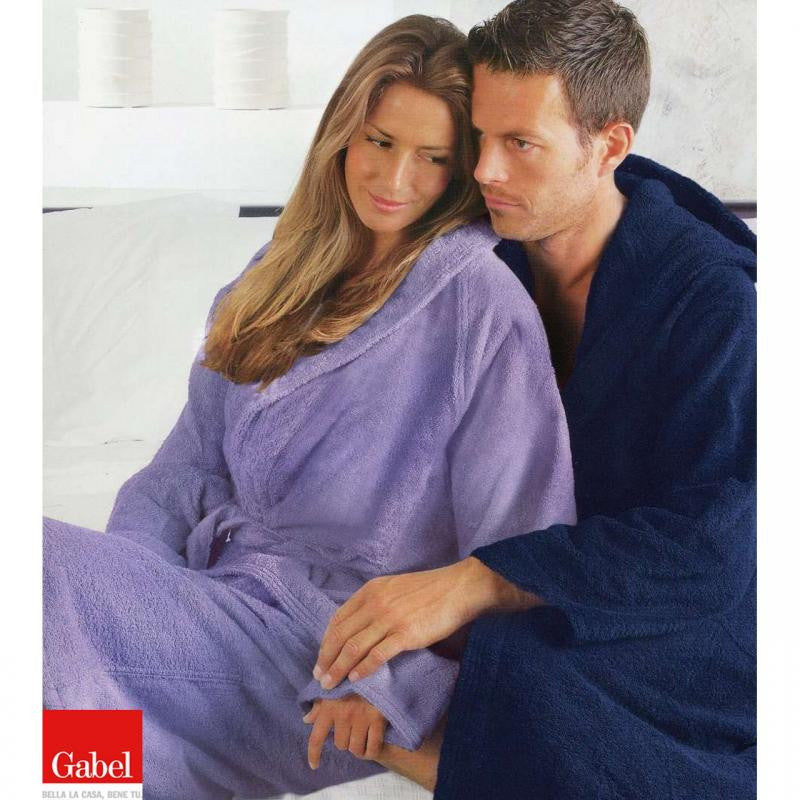 Accappatoio in spugna di puro cotone idrofilo, modello TINTAUNITA di Gabel. Modello con cappuccio e cintura cucita sul centro schiena. Pratico e comodo ideale a casa e in viaggio per chi non ama i tessuti leggeri e in microfibra. La spugna è garantita da un marchio leader nella biancheria da bagno.