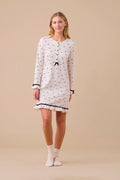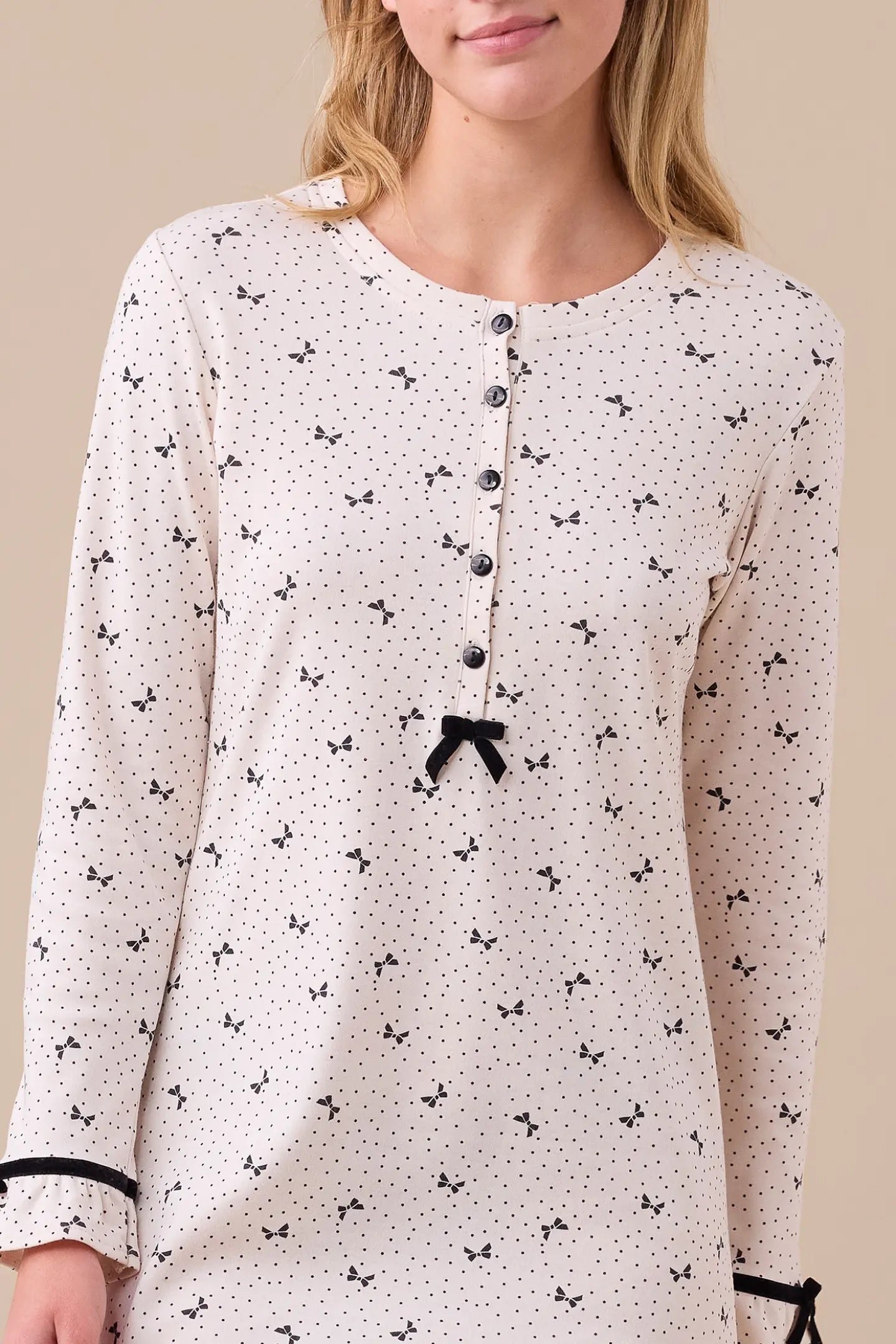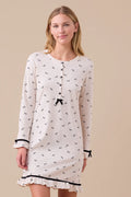 Realizzata in caldo cotone morbido e traspirante, presenta una romantica stampa a fiocchi, con maniche lunghe e una pratica abbottonatura frontale a 5 bottoni.