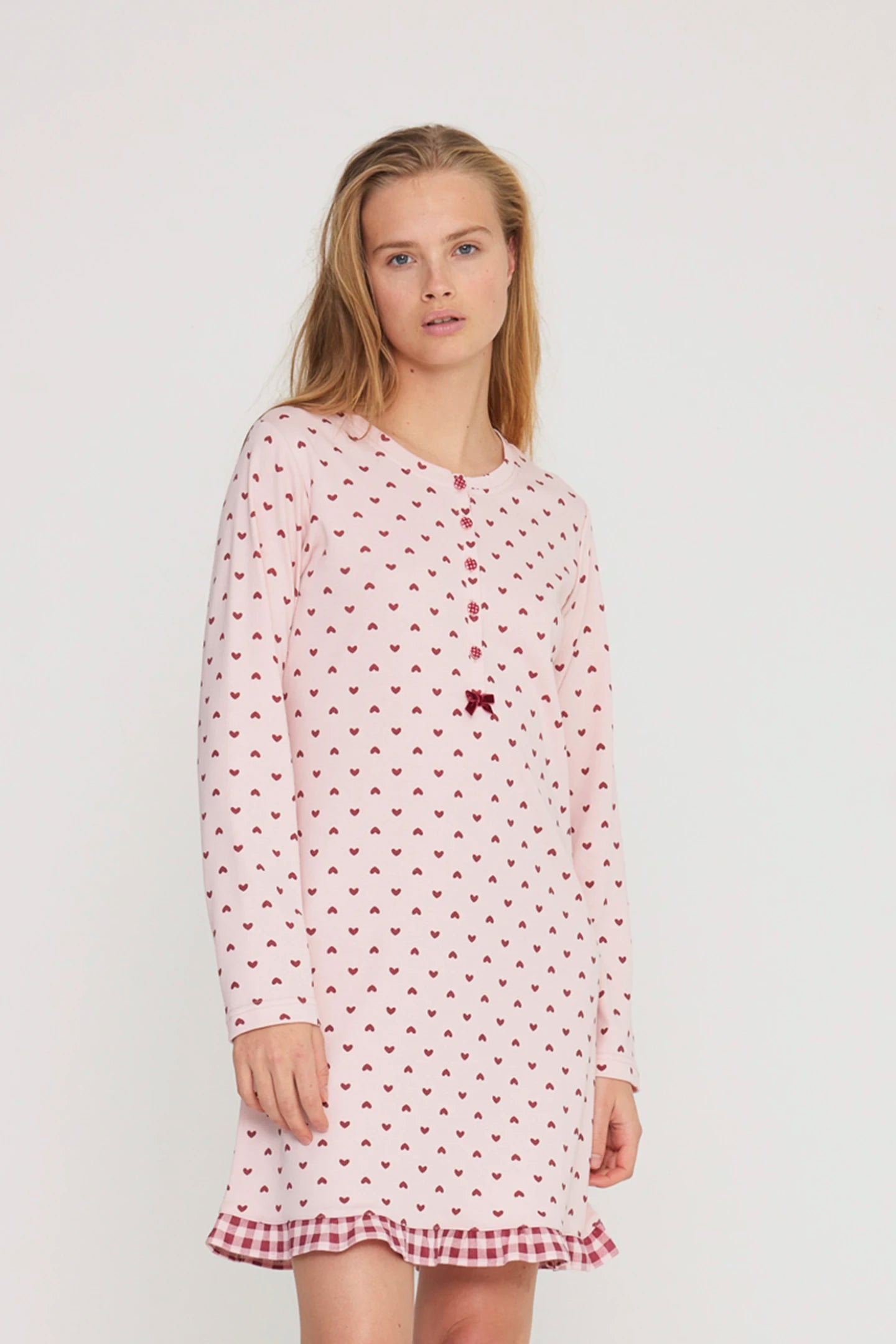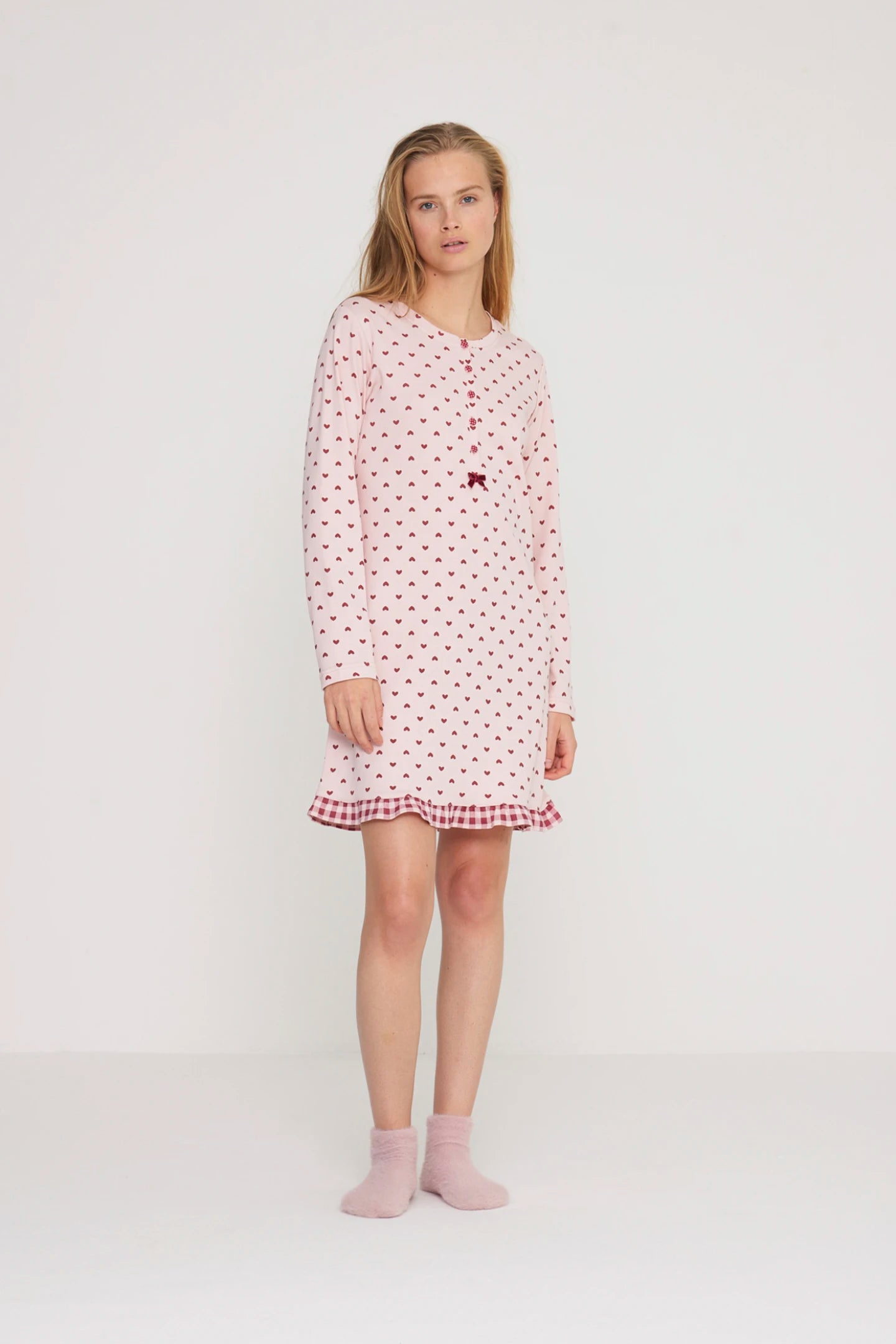 Camicia da notte donna petit coeur in caldo cotone con collo cinque bottoni e fiocco in ciniglia, romantica stampa cuoricini all over e rifinitura con rouches in graziosa stampa vichy.