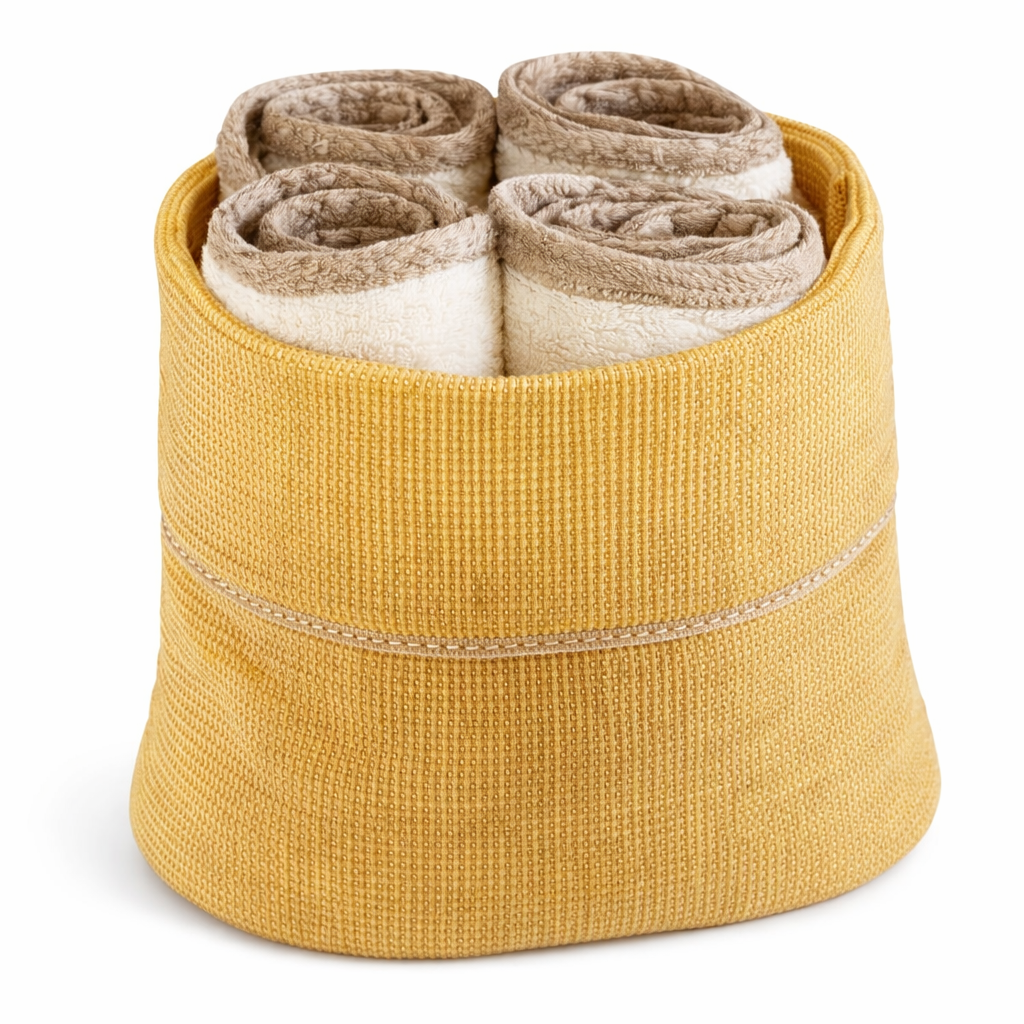 Cestino con 4 lavette in spugna 30X30. Esperienza e creatività italiana. Spedito nella sua busta originale. Perfetto per te o come idea regalo di lusso.