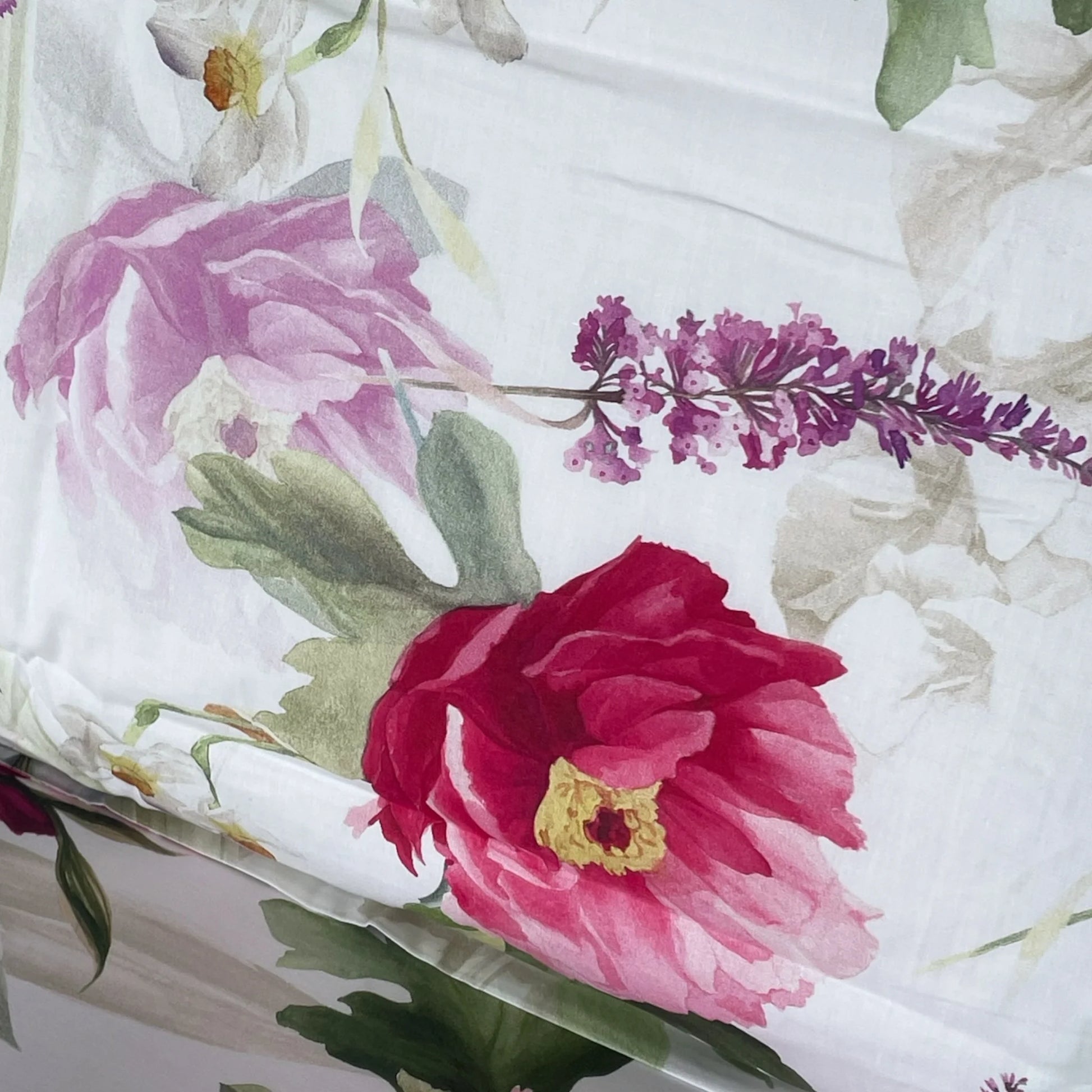 Il lenzuolo inferiore con angoli (175x205 cm) è in tinta unita coordinata alla palette della stampa, mentre le due federe con volani (50x80 cm) ripropongono il motivo floreale, completando il set con uno stile elegante e armonioso.