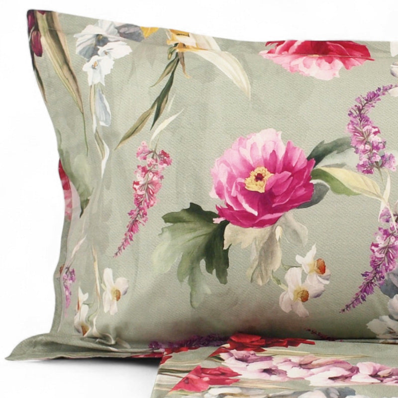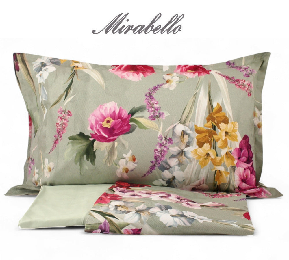 Completo Lenzuola Copriletto Matrimoniale MIRABELLO Emporium - Charming Flowers fondo Verde
