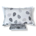 Il lenzuolo inferiore con angoli (175x205 cm) è in tinta unita abbinata, mentre le due federe con volani (50x80 cm) riprendono la fantasia geometrica, completando il set con stile.