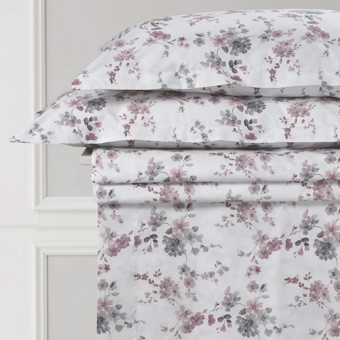Elegante completo lenzuola matrimoniale effetto copriletto in puro cotone pettinato 100%, impreziosito da una raffinata fantasia floreale.
