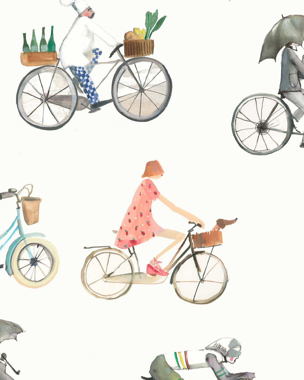 Una fantasia originale e dinamica con biciclette colorate su fondo chiaro, perfetta per dare un tocco allegro, moderno e raffinato alla camera da letto.