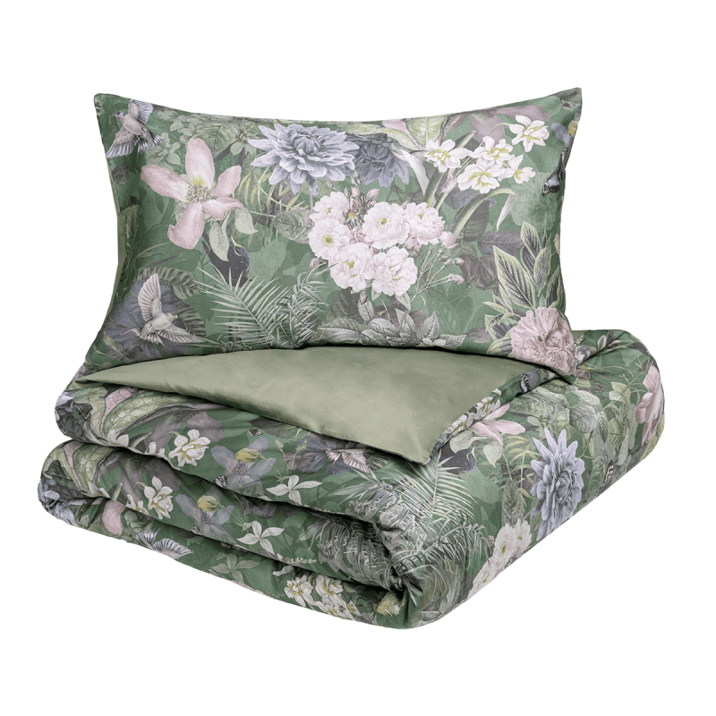 La parte superiore del sacco e delle federe è stampata con dettagli raffinati, mentre il retro è in raso tinta unita, per un contrasto equilibrato e sofisticato.