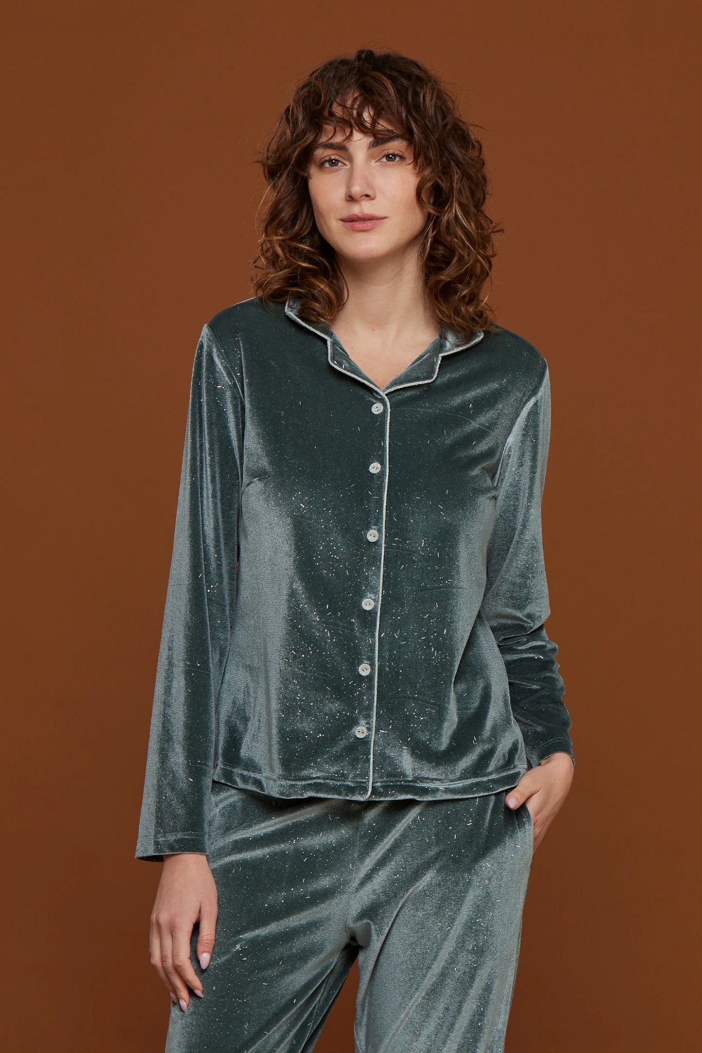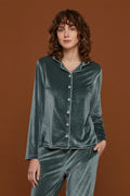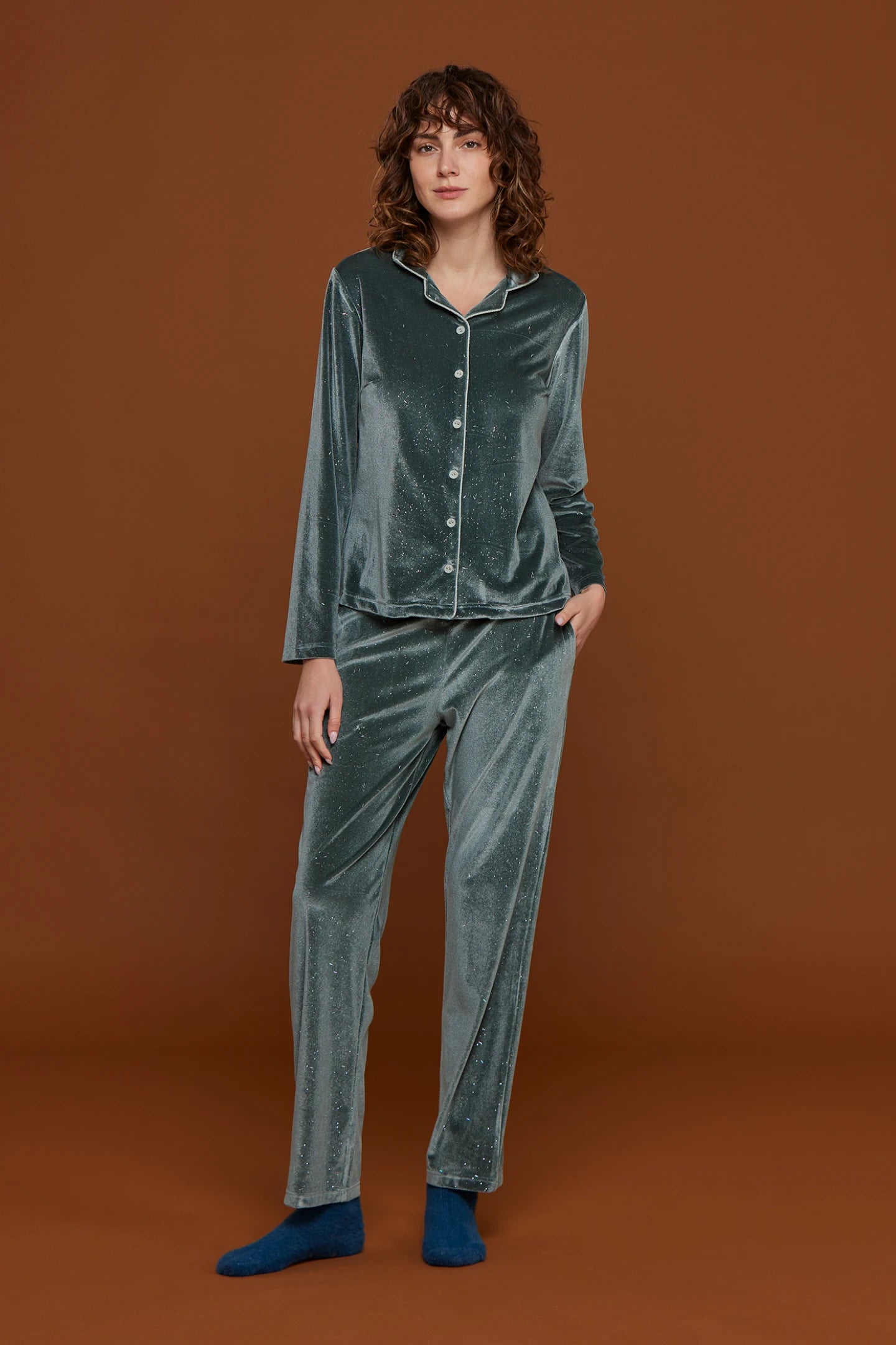 Pigiama donna ciniglia velvet top manica lunga con abbottonatura centrale, colletto con rever e scollo a V e pantalone con tasche senza polsini.