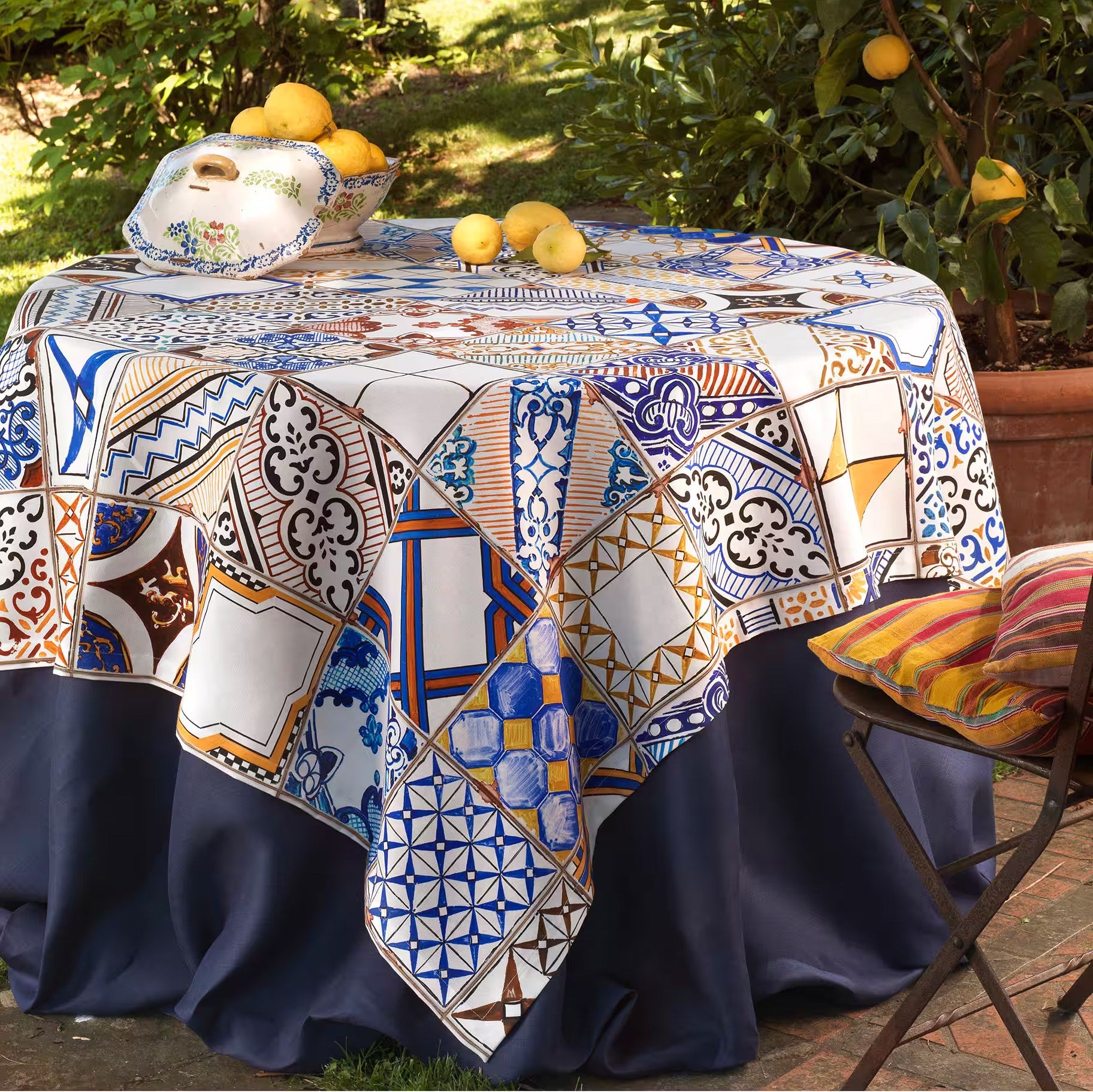 Porta un tocco di stile mediterraneo sulla tua tavola con il runner Azulejos firmato Tessitura Toscana, un complemento d’arredo elegante e dal design ricercato.