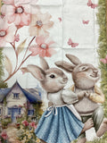 Fantasie con coniglietti, fiori primaverili e casette come da immagini
