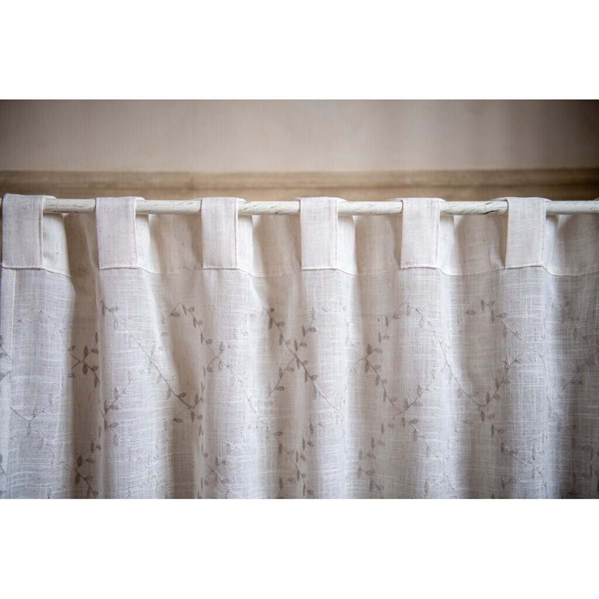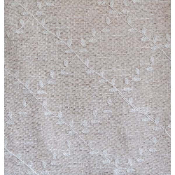 Elegante e versatile tenda tinta unita misto lino con ricamo a motivo romboidale di delicate foglioline Si appende attraverso passanti a scomparsa ed è ideale per essere utilizzata in qualsiasi ambiente, da sola o a completamento di altre tende.