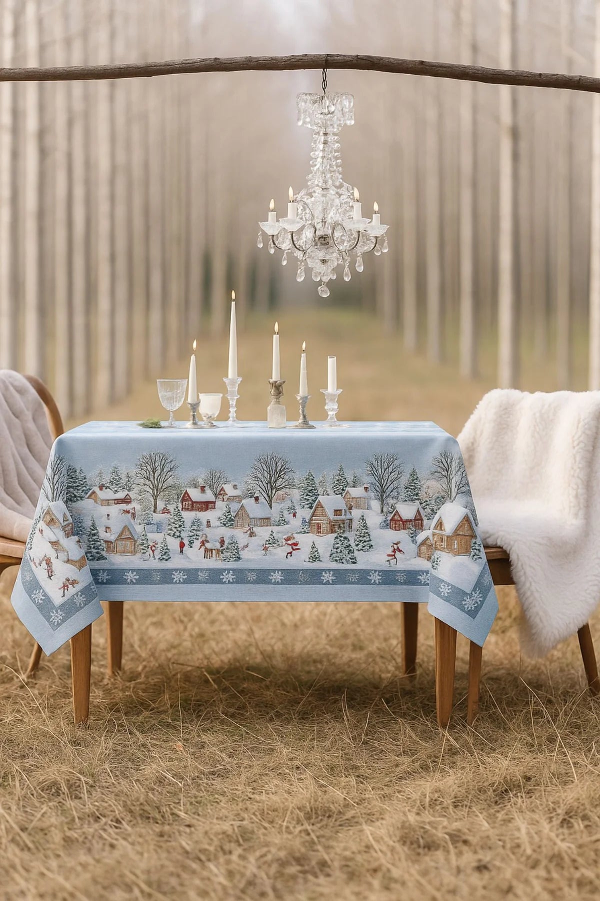 La tovaglia Borgo Alpino firmata Blanc MariClo’ è un invito a vivere la magia delle montagne innevate e il fascino degli chalet d’inverno direttamente a tavola. Realizzata in pregiato tessuto Gobelin, unisce resistenza e raffinatezza, distinguendosi per il disegno ricco di dettagli che raffigura suggestivi paesaggi alpini.