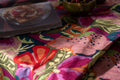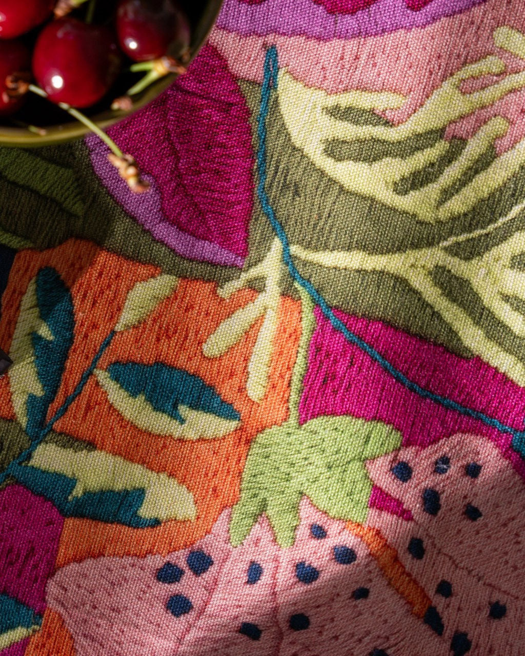 Ogni foglia, ogni corolla racconta una storia di sfumature che si intrecciano in armonia, dal malva tenue al viola profondo. La tovaglia KIRIKU raffigura un paesaggio onirico di vegetazione rigogliosa, che trasporta lontano dal quotidiano fin dal primo sguardo.