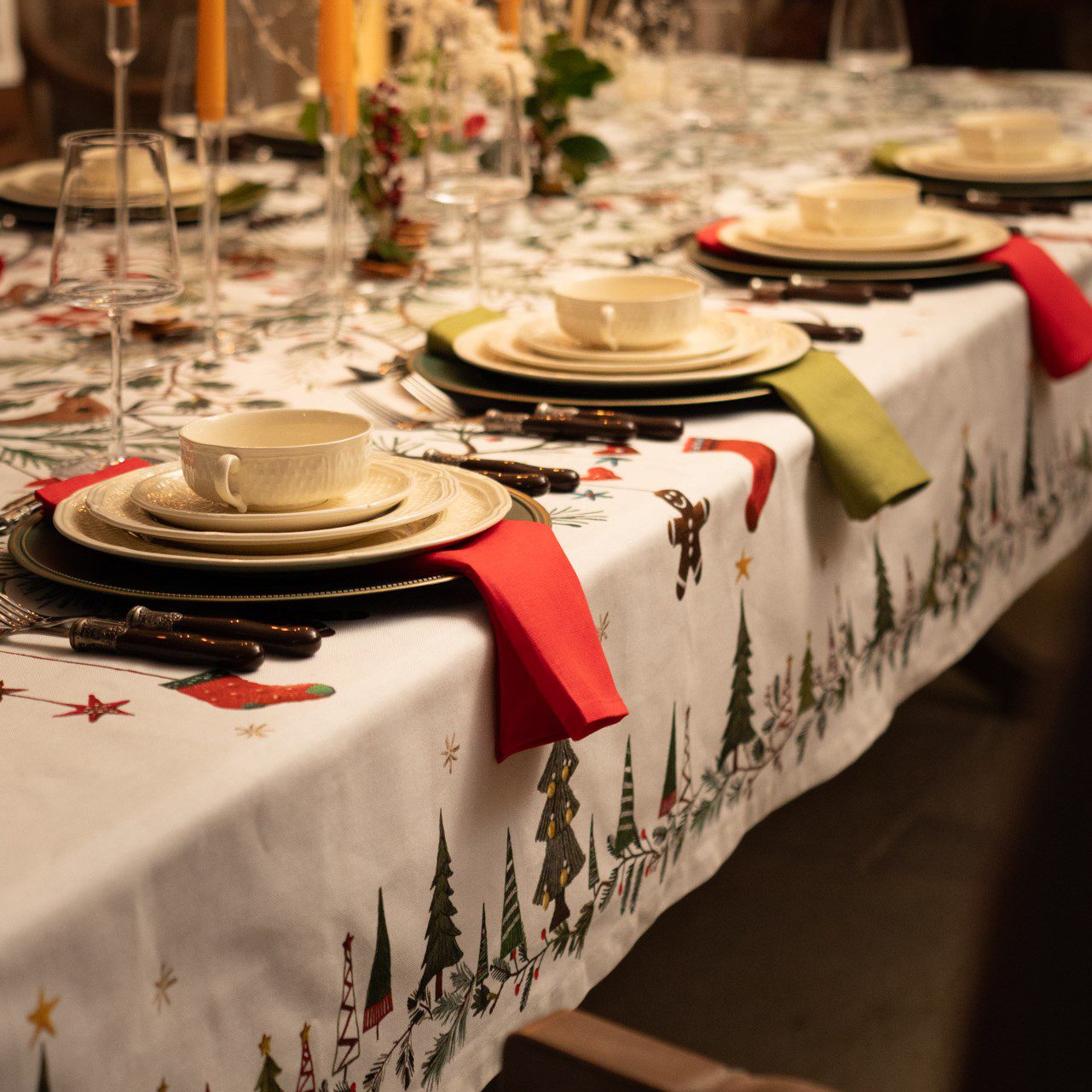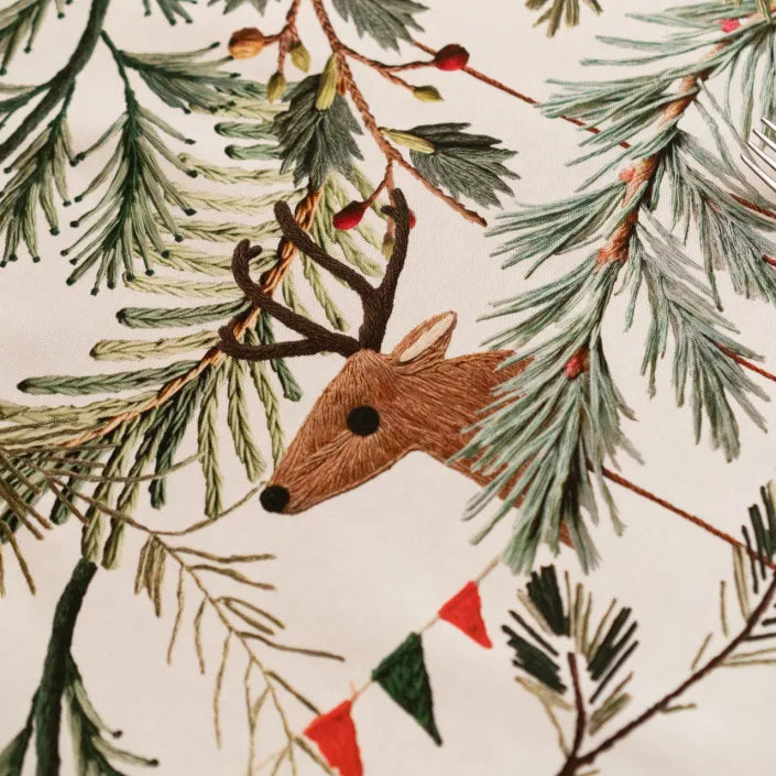 Illumina la tua tavola con la tovaglia natalizia Rudy firmata Tessitura Toscana Telerie. Realizzata in 100% cotone Made in Italy, unisce praticità e raffinatezza grazie alla stampa natalizia con renna, rami e bacche.