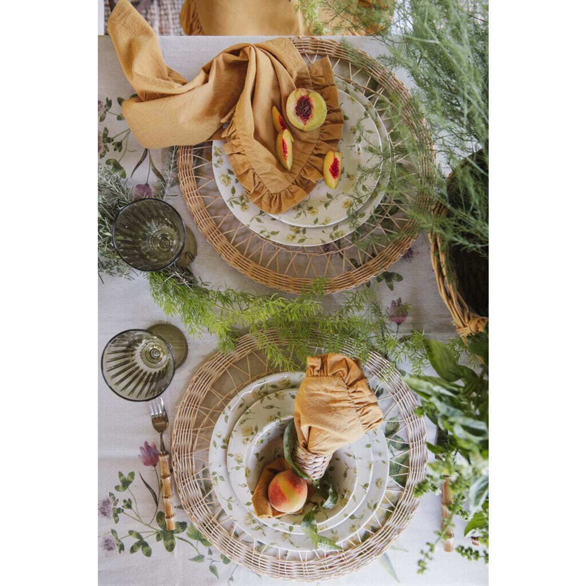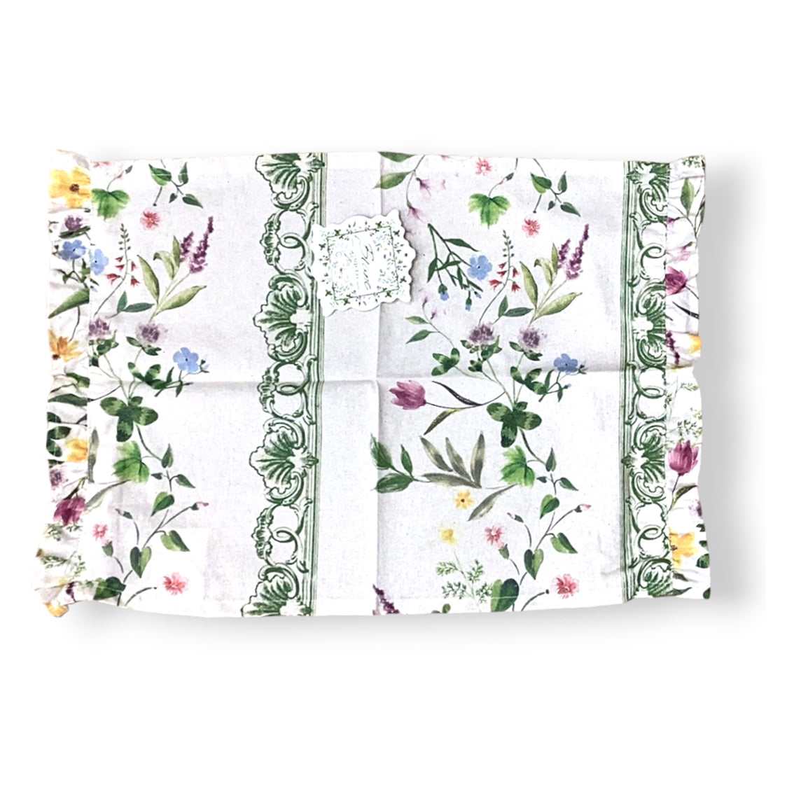 Romantica tovaglietta americana rettangolare con volant e stampa floreale proposta da Blanc Mariclo' per la collezione Vild Flower. Ideale come tovaglietta per la colazione, come romantico sottopiatto o come centrino.