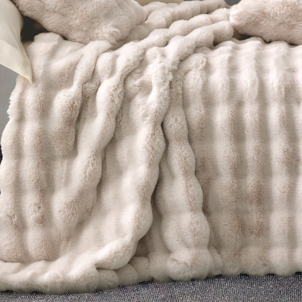 Realizzata in eco pelliccia jacquard con effetto goffrato, è rifinita con fodera in vellutino per un comfort assoluto e un tocco di lusso.